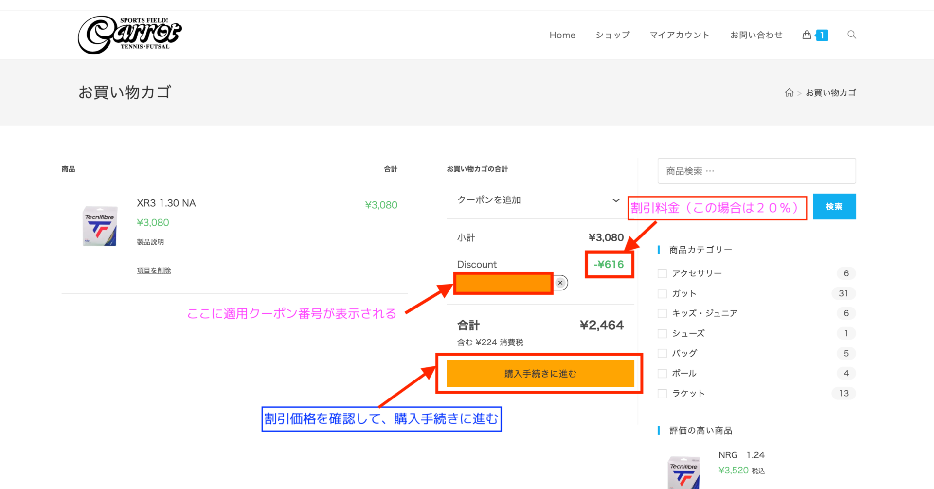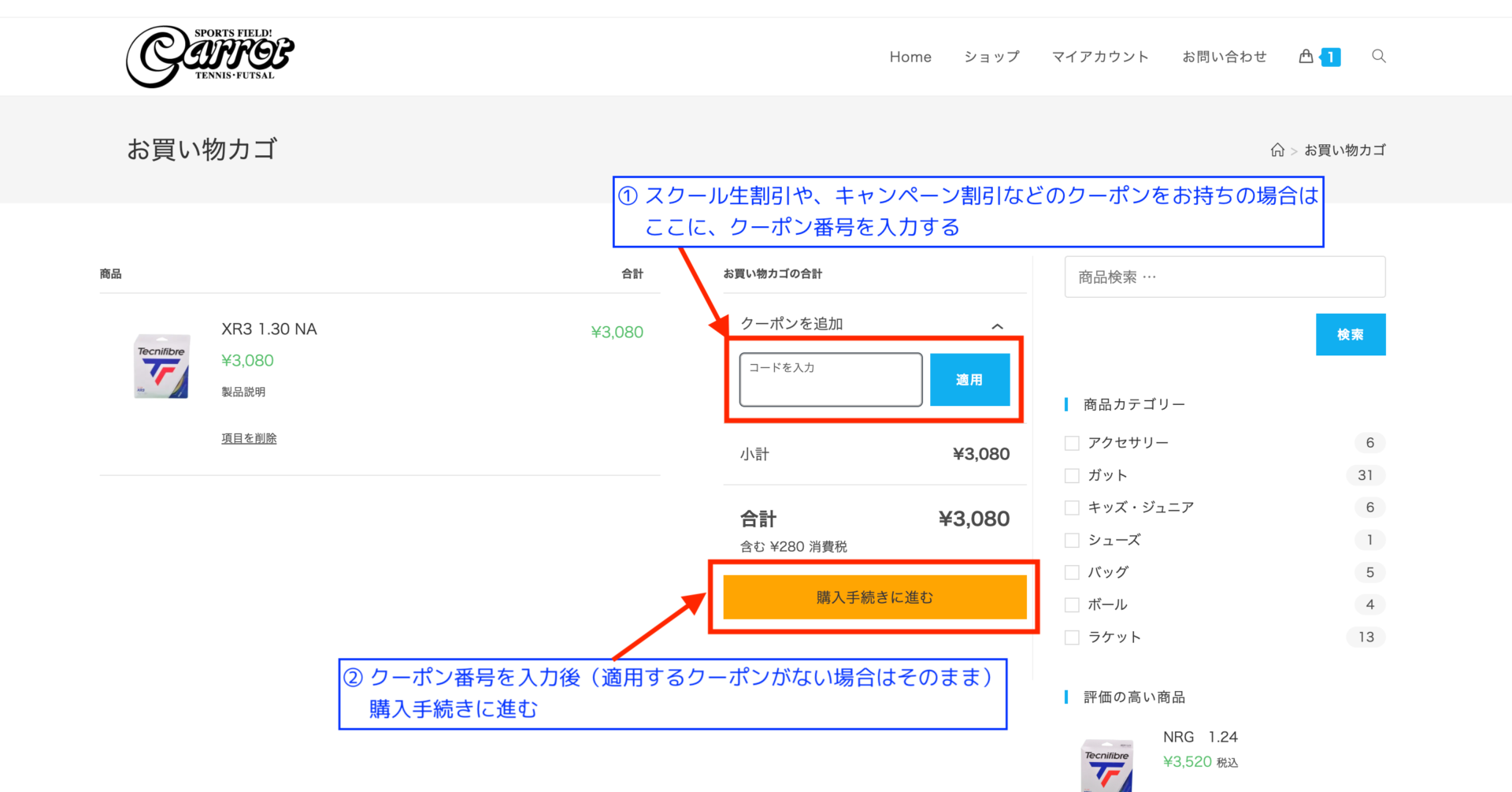 - カート(お買い物カゴ)のページでは、注文処理に際して、クーポンの入力が可能となっております。