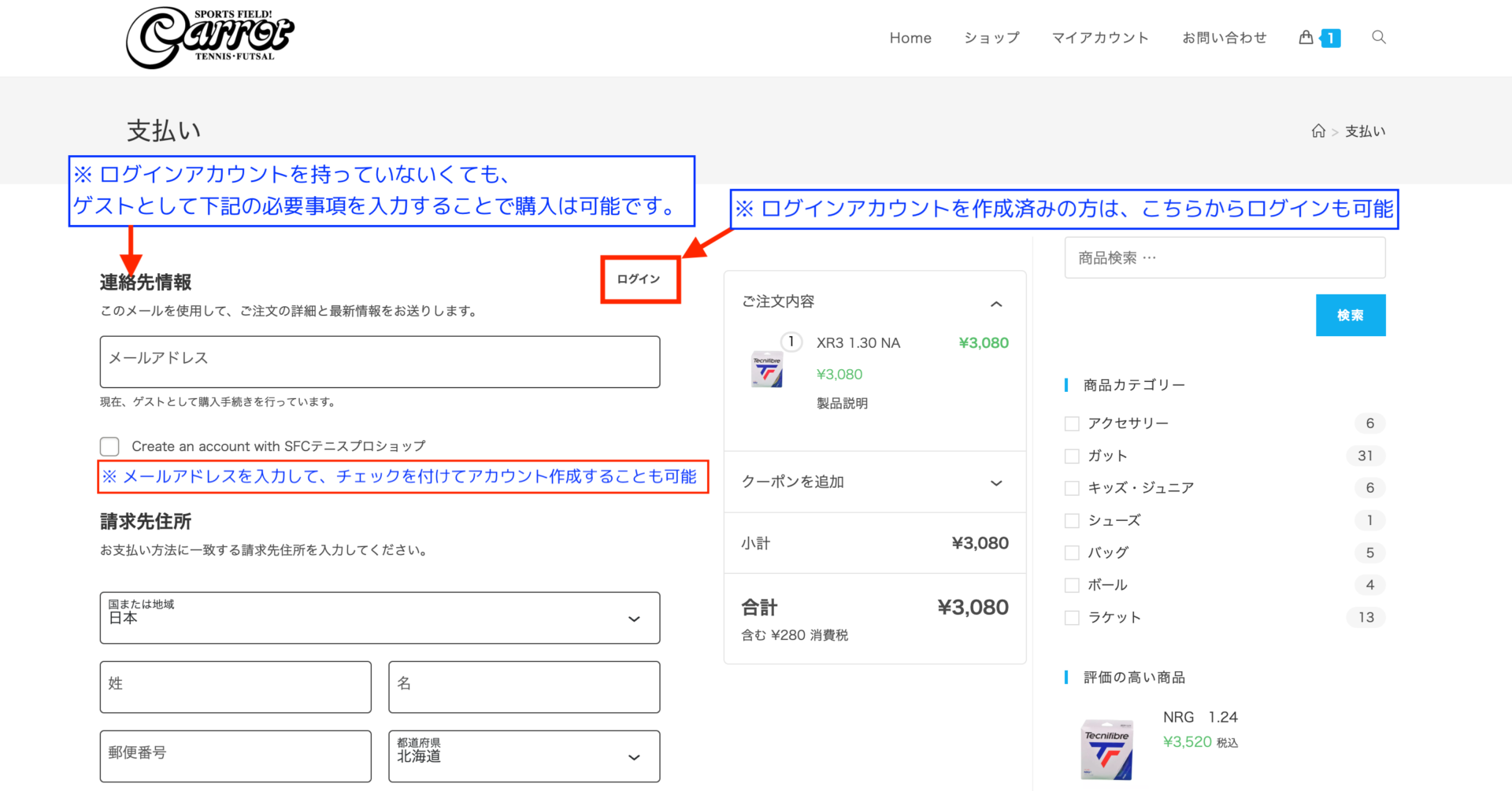 - ログインアカウントを持っていなくても、必要事項を入力して購入する事も出来ます。