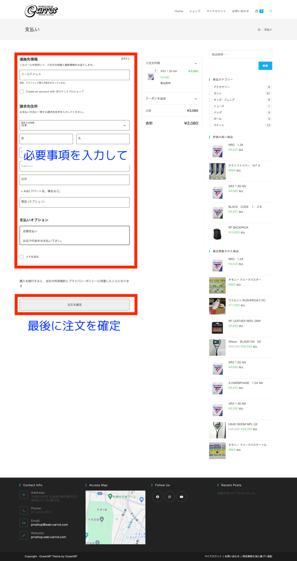 - ゲスト購入、または会員初回登録時には、画像にある必要事項を入力して、最後に注文を確定する。